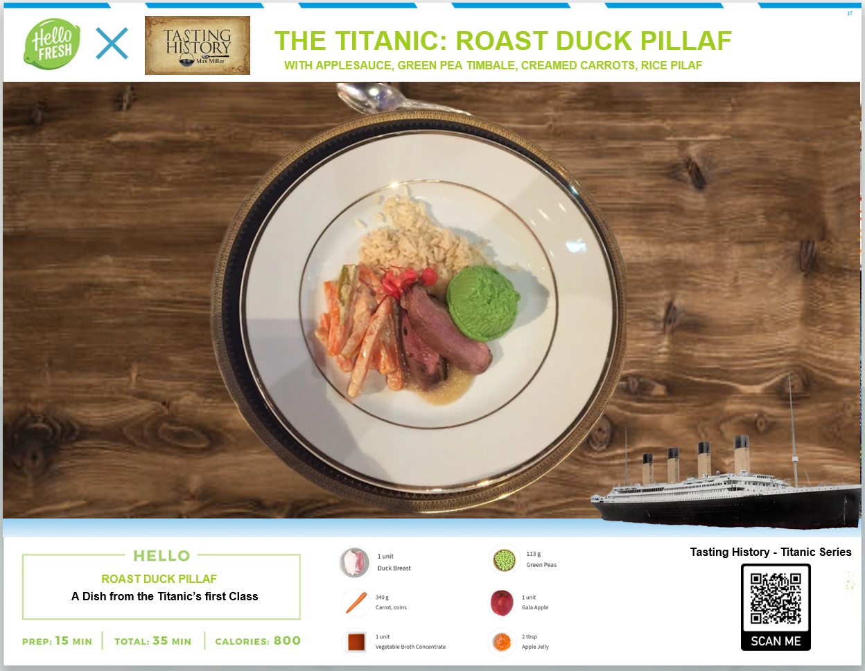 After watching other videos, I noticed that HelloFresh was a sponsor. It clicked! HelloFresh provides meal kits with pre-portioned ingredients and easy to follow instructions. If I wanted to have my Titanic meal in an approachable manner, HelloFresh could make it happen. I can receive my meal kit at home with ingredients and instructions all laid out for me. They could provide me a link to the episode that goes through the steps and talks about the meal. I could one day have my Titanic meal after all!